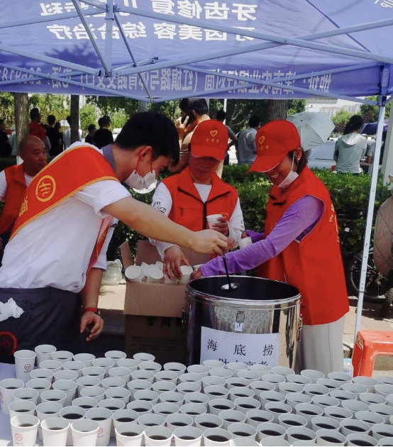 “天氣太熱了,喝點楊梅汁解解暑吧,祝您的孩子馬到功成,前程似錦!”在成都市新都中學高考考點門前,來自海底撈七一廣場店的志愿者員工們向等候的家長送上清涼解暑的飲品和小扇子。
