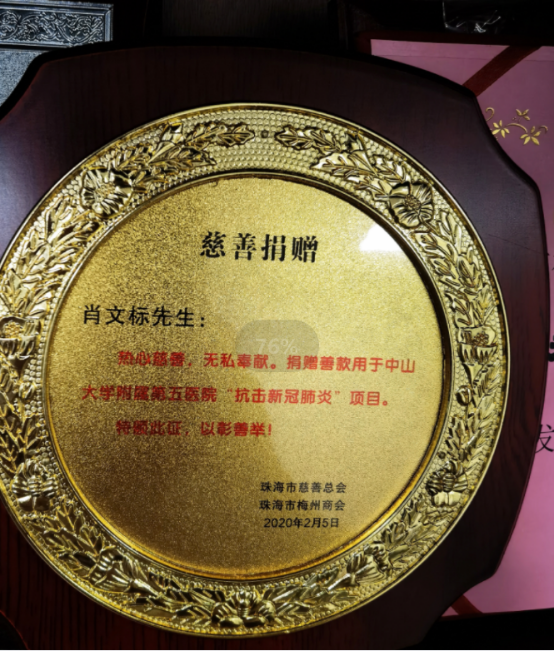 ▲珠海市慈善總會、珠海市梅州商會授予肖文標(biāo)的獎牌