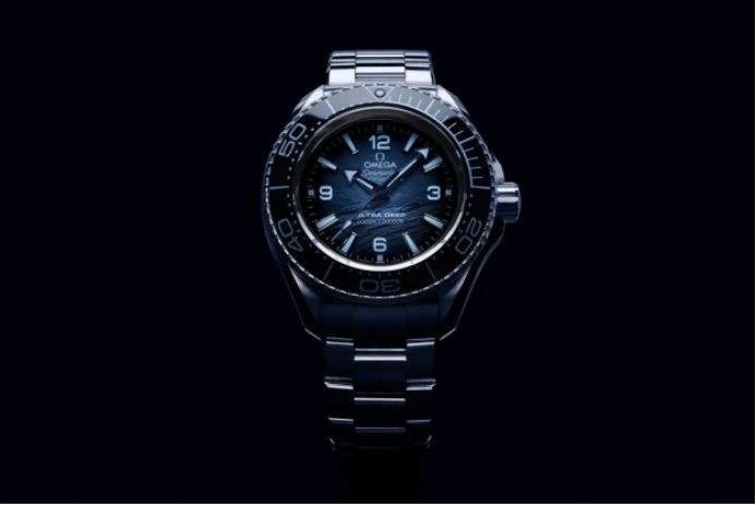這次歐米茄海馬75周年紀(jì)念款的表盤,雖然每一款的質(zhì)感都不同,卻都采用了漸變藍(lán)色的暈染效果,歐米茄稱之為“Summer Blue”。但是根據(jù)每個(gè)款式所能承載的下潛深度不同,表盤采用的藍(lán)色色調(diào)也不同,基本上對應(yīng)照光層,弱光層,深海層,深淵層的不同深度下海水呈現(xiàn)的效果。比如6000米已經(jīng)到了海底的深淵層,這個(gè)深度是需要探照燈照明的,那海洋宇宙Ultra Deep 6000M專業(yè)潛水表表盤的藍(lán)也就更加深邃,幾乎接近黑色。