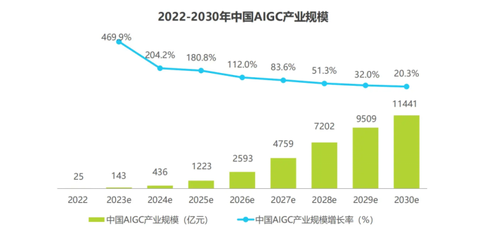 報告指出,2023年中國AIGC產(chǎn)業(yè)規(guī)模約為143億元,隨后進入大模型培育期,持續(xù)打造與完善底層算力基建、大模型商店平臺等新型基礎設施,以此孕育成熟技術(shù)與產(chǎn)品形態(tài)并將其對外輸出。到2030年中國AIGC產(chǎn)業(yè)規(guī)模有望突破萬億元,達到11441億元。