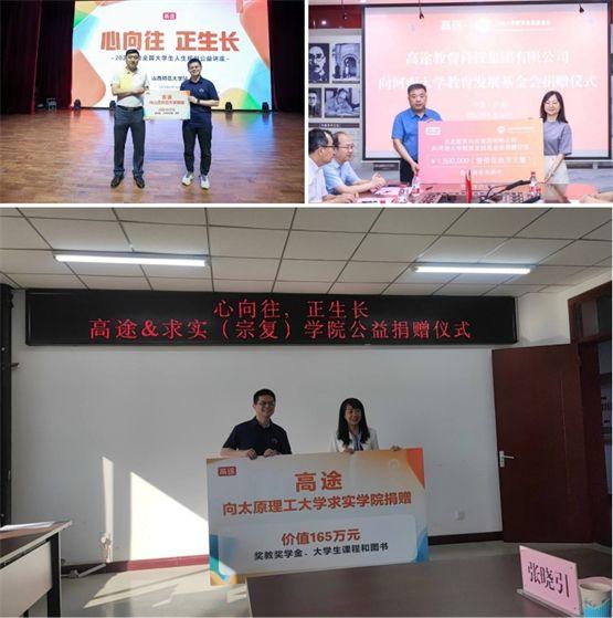 為幫助引導(dǎo)當(dāng)代大學(xué)生樹立正確的學(xué)習(xí)觀和就業(yè)觀,增強(qiáng)職業(yè)生涯規(guī)劃意識(shí),培養(yǎng)創(chuàng)新創(chuàng)業(yè)思維,保持奮發(fā)昂揚(yáng)向上的精神狀態(tài)。6月12日到15日,高途先后向山西師范大學(xué)、太原理工大學(xué)、河南大學(xué)、武漢理工大學(xué)四所大學(xué)捐贈(zèng)了總價(jià)值超過600萬元的課程書和書籍,支持在校大學(xué)生學(xué)習(xí)提升。同時(shí)高途在山西師范大學(xué)、太原理工大學(xué)設(shè)立了連續(xù)三年的“獎(jiǎng)教獎(jiǎng)學(xué)金”,用于獎(jiǎng)勵(lì)有突出貢獻(xiàn)的教學(xué)項(xiàng)目和表現(xiàn)優(yōu)異的在校大學(xué)生。