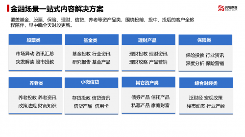 貝塔數(shù)據(jù)針對金融場景提供了一站式的內(nèi)容解決方案,覆蓋基金、股票、保險、理財、信貸、養(yǎng)老等不同資產(chǎn)類別,并以投前、投中、投后的全過程為核心,為金融機構提供全面的客戶陪伴服務。