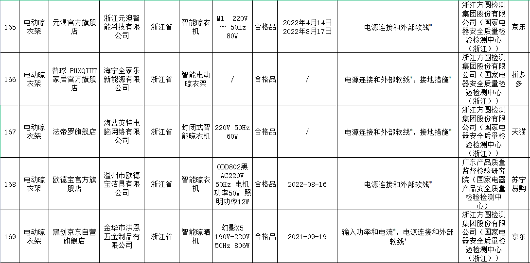 本次電動(dòng)晾衣架抽查檢驗(yàn)9個(gè)省(市)48家企業(yè)生產(chǎn)的52批次產(chǎn)品,包括天貓、京東、拼多多、抖音等電子商務(wù)平臺(tái),發(fā)現(xiàn)24批次產(chǎn)品不合格,涉及卡瑞琪(courage)、顧家、格峰、盼盼、歐蘭特等品牌。