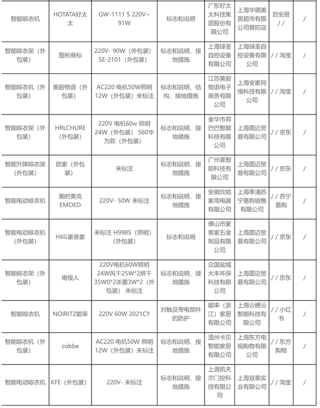 無獨(dú)有偶,據(jù)上海市市場(chǎng)監(jiān)督管理局發(fā)布的2022年上海市產(chǎn)品質(zhì)量監(jiān)督抽查結(jié)果(第十批)顯示,11批次智能晾衣架抽查不合格,其中涉及HOTATA好太太、美時(shí)美克EMOED、南極人等品牌。